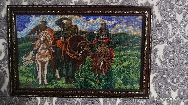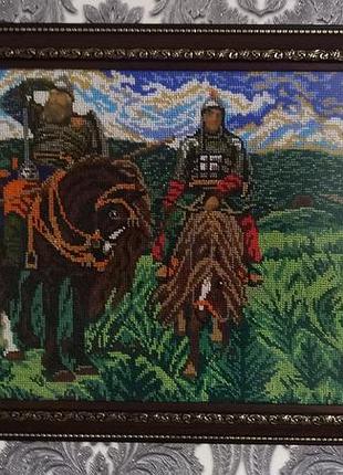 Картина три богатыря вышита чешским бисером, обрамлена в декоративную рамку с антибликовым стеклом, может быть замечательным подарком к новогодним праздникам