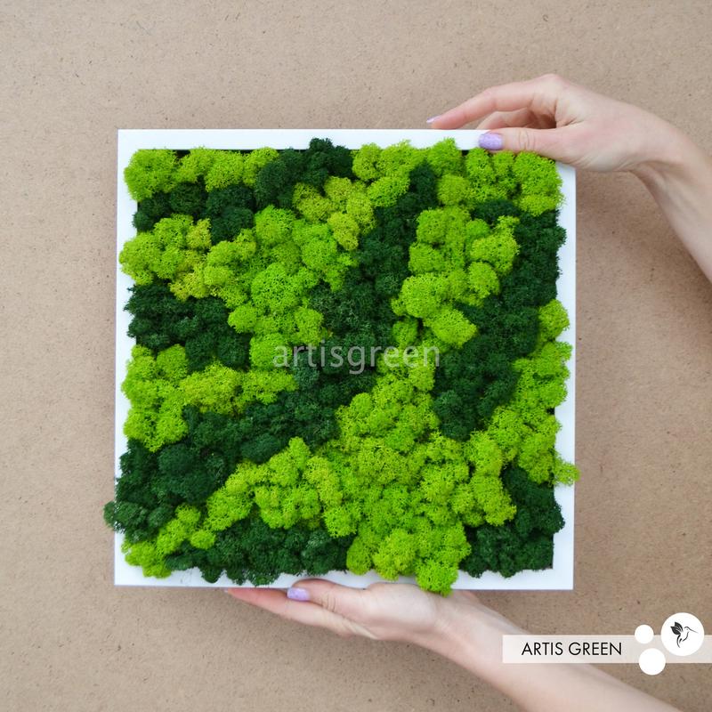 ЭКО-КАРТИНА ИЗ ПУШИСТОГО СКАНДИНАВСКОГО МХА В БЕЛОЙ РАМКЕ. ### Настенная картина с настоящим мхом, поможет гармонично украсить ваш интерьер и стать изюминкой вашего дома. Кроме того, такая картина действительно оригинальный вариант подарка для близких, коллег или партнеров. ### ПОЧЕМУ ИМЕННО ТАКИЕ ЭКО-КАРТИНА СО МХОМ? Корпус из дерева или фанеры. Можно выбрать любой цвет покрытия корпуса. Стабилизированный скандинавский мох в 20-ти разных расцветках. Оригинальное дополнение к любому интерьеру. Отправляем по всей Украине. При доставке - прочная упаковка за наш счет. Важно отметить, что мох не имеет корней, поэтому он поглощает воду и питательные вещества из воздуха. Таким образом, он также поглощает загрязнение воздуха и углекислый газ, что улучшает качество воздуха в вашем помещении. ### И еще, несколько фактов о стабилизированном мхе: ### Мох не требует полива или освещения, что очень удобно. Мох остается свежим около 8-10 лет. Поэтому такой рождественский венок из мха будет радовать вас много лет. Мох вызывает эмоции! А это тот самый WOW-эффект, которого все стремятся добиться от подарков. Мох очень приятный и мягкий на ощупь, снимает стресс, вызывает желание прикоснуться к нему. То есть человек будет постоянно контактировать с вашим подарком, вспоминая о вас и вашей компании.