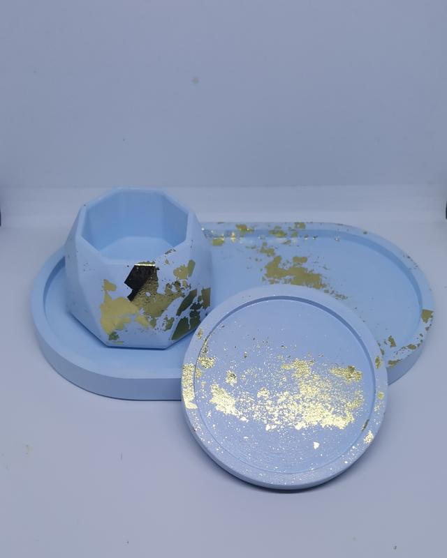 Минимальный заказ в магазине 100 грн!!! Материал :гипс. Размер: Подставка круглая 8 см. Піднос овал 18/9.9/1.8 см. Кашпо : в 4.1 см* ш 6 см. Объем: 30 мл Покрытие: поталь+лак. Набор 3 шт.