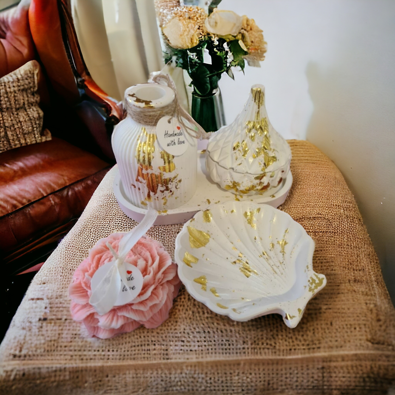 В комплект входит гипсовая подставка длиной 18 см,ваза для сухоцветов высота 10 см,шкатулка инжир для украшений, подставка для украшений,соевая ароматическая свеча пион 70 гр и круглая подставка для свечи диаметром 8 см(на фото нет). Можно выполнить в различных цветах и стилях.