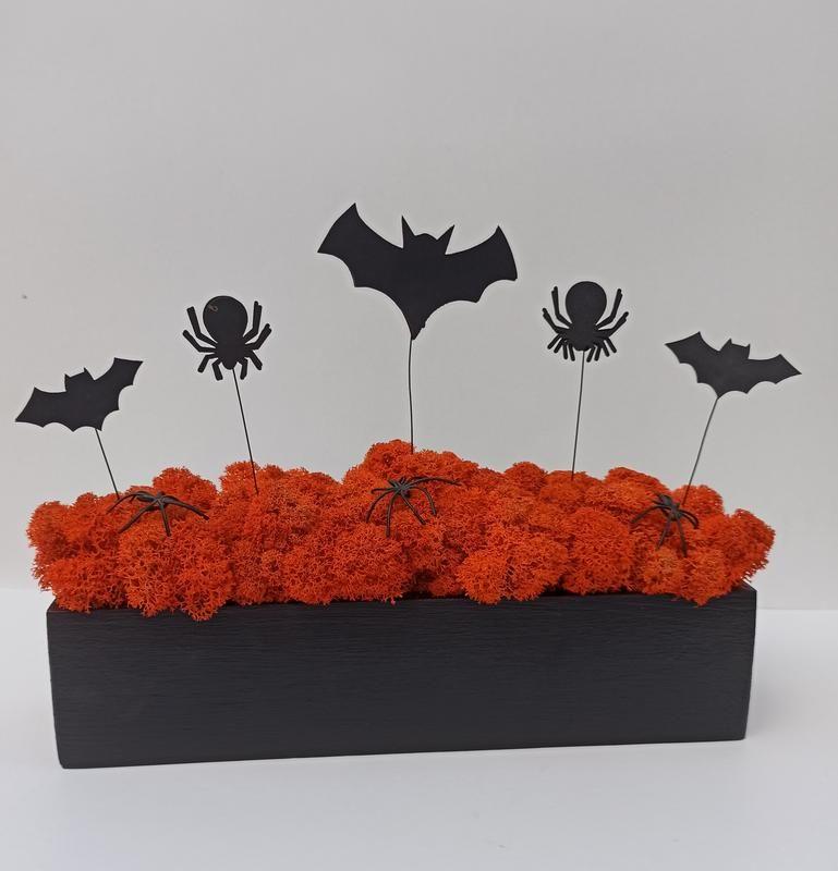 Декор до хеловіну хеллоуїну. чорне кашпо з оранжевим мохом та кажанами