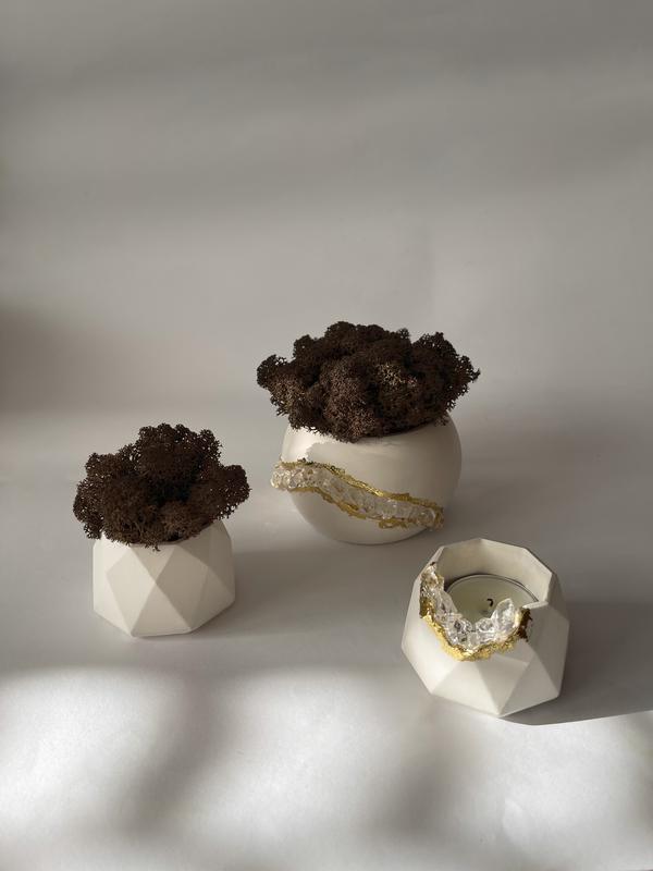 Гипсовое кашпо и подсвечник. Украшено кристаллами и золотом, которое красиво переливается под солнечными лучами, что дает ощущение магии. Также скандинавский мох в трендовом шоколадном цвете. Такой набор эстетически вписывается в ваш уголок. Больше товаров можете просмотреть в нашем инстаграме - ************