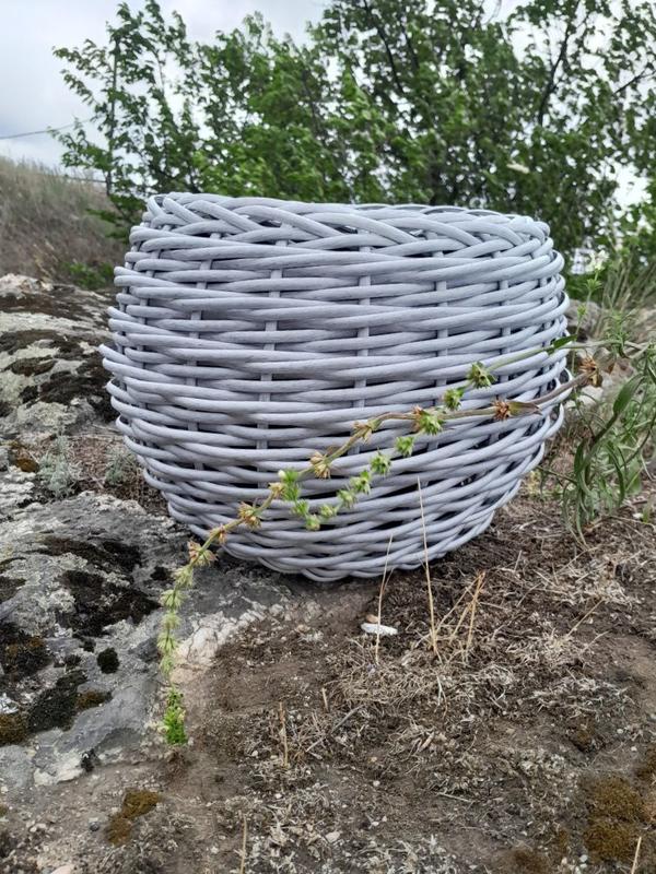 Кашпо из искусственного ротанга на 8 литров. высота 23 см.диаметр дно 19 см.диаметр верх 20 см.цвет свет серый.под заказ дорогой цвет и размер