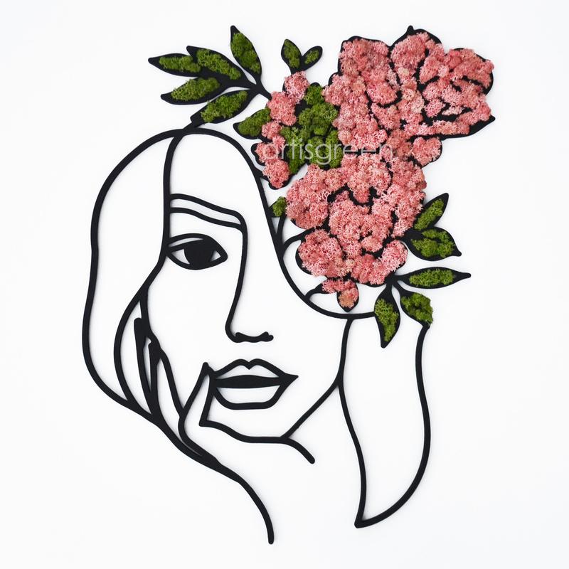 Панно для интерьерного декора из дерева и мха «девушка с цветами», п01
