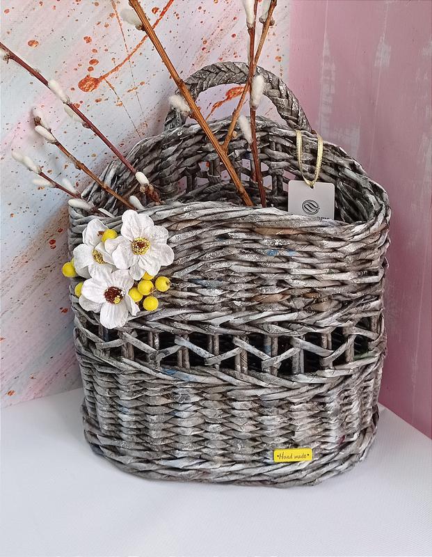 Корзинка для цветов и других мелочей. Можно крепить на стену. Сделана из бумажной лозы. Покрыта лаком. Сухая и влажная чистка. Размер 31*25*15 см.