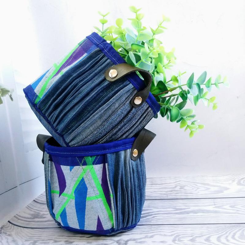 Ці кашпо або маленькі кошики для зберігання були створені в рамках напряму recycling - повторного використання речей, зокрема джинс 😊 Дуже приємно, коли можна дати речам нове життя і сенс ❤️ через множинної відстрочки основи і щільною підкладки чудово тримає форму. Можна використовувати і як кошики для зберігання 🤓 Ручки і декоративні елементи - шкіра, яка була викуплена на виробництві, яку відбракували з-за не рівномірності забарвлення і в підсумку б викинули. Купуючи таку річ, ви отримуєте корисну річ, унікальний авторський предмет, а так само допомагаєте в переробці речей 😊 Розмір однаковий для двох кашпо: висота 12 см, діаметр 14 см Вартість за пару І знижка 10% того, хто у відповідь віддасть свої вже непотрібні джинси для нових речей 🤓