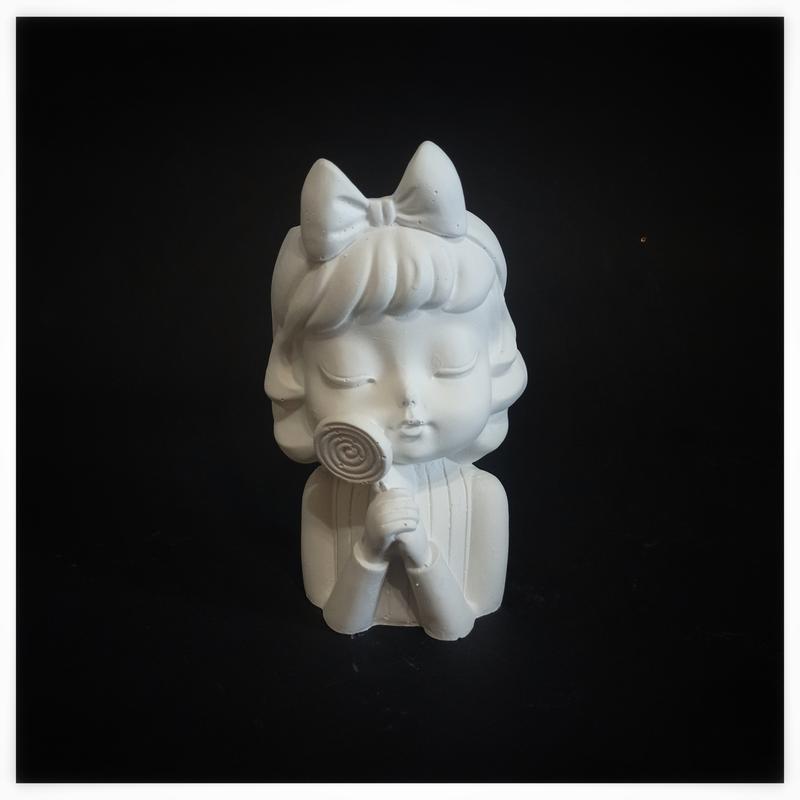 Данное изделие с отверстием для сукуленты и мха. Туда также можно посадить маленький кактус или сукулент. Рост девочки с бантиком - 13 см. Наша студия занимается изготовлением эко декора из скульптурного гипса. В ассортименте множество кашпо / горшочков , подсвечников , вазочек и другого декора
