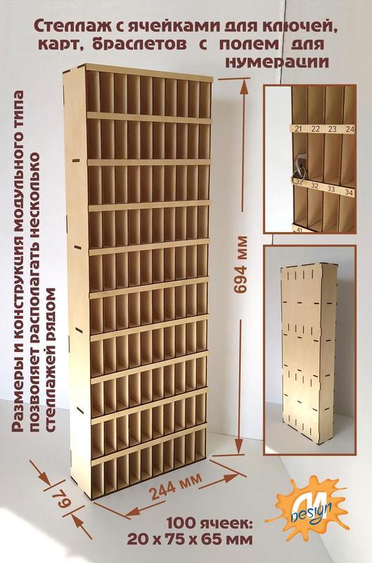 Практичный стеллаж с ячейками для ключей, карт, браслетов с нумерацией Для фитнес центров, гостиниц, отелей и.д. Предусмотрено поле для нумерации ячеек методом гравировки или самостоятельно. Габариты стеллажа - длина 244мм х глубина 79мм х высота 694мм. Размер ячейки - длина 20мм х глубина 75мм х высота 65мм, количество ячеек -- 100шт. Стеллаж сделан из фанеры 4мм, покрыт акриловым лаком и собран. Размеры и количество ячеек, наличие задней стенки, можем менять по вашему запросу.