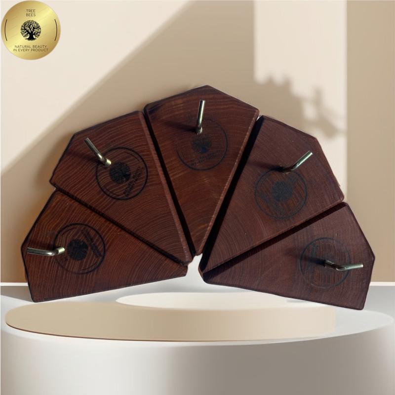 Кожен елемент ключа має форму трикутника із закругленими кутами, що нагадує ромб або ромбовидну окантовку. Видима текстура деревини, що надає виробу природний і теплий вигляд. Ключниця складається з шести однакових елементів, які можна розташувати окремо або разом, як показано на фото. Це дозволяє створювати різні композиції та адаптувати ключ до ваших індивідуальних потреб. У кожному елементі в центрі знаходиться металевий гачок золотистого кольору. Гачки призначені для підвішування ключів. Дизайн ключа мінімалістичний і сучасний. Відсутність зайвих деталей, що робить його універсальним для будь-якого інтер'єру. Брелок виглядає стильно і функціонально. Він поєднує в собі природну красу дерева і практичність. Мобільність конструкції дозволяє використовувати її в різних приміщеннях або навіть брати з собою в подорожі. Легкий монтаж - просто зніміть захисну плівку і приклейте в зручному для Вас місці!