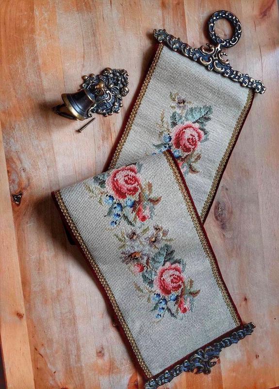 Раритет. Великолепная деталь гостиной. Антикварная замковая сосетка с массивным бронзовым колокольчиком и барельефной плакеткой. Нижняя Саксония. 1960-е годы. Ручная работа, красивая качественная вышивка шерстяной нитью. С вкраплением золотистой нити, эффект люрекса. Края декорированы бархатной тесьмой. Отличное состояние. Общая длина шлейфа с учетом рукоятки и верхней фурнитуры 112 см., ширина 22,5 см, крепление колокольчика 13 см. в высоту, сам колокольчик 6 см. Вес около 1.2 кг. Сонитка - непременный атрибут всевозможных заведений или жилья более высоких европейских состояний. Предназначена для вызова обслуживающего персонала - подчиненных, дворецких, слуг или супруги. Не требует электроэнергии, электронных коммуникаций, ремонта, согласования и регистрации.