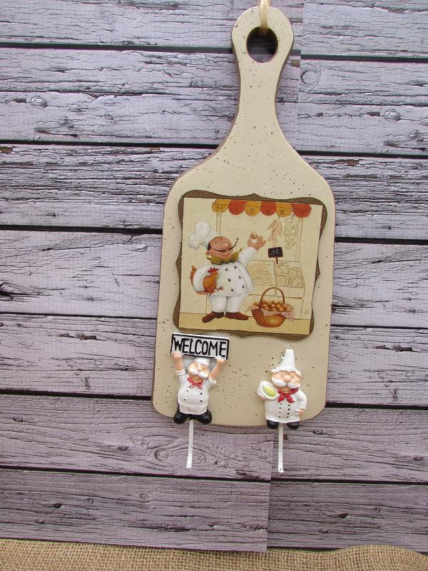 Вешалка для кухонных полотенец или прихваток из бука. Вешалка имеет оригинальную форму, в виде кухонной доски. Украшена вешалка фигурной накладкой и отличными крючками с кухорями. Такая оригинальная вешалка украсит любую кухню, будет эксклюзивным подарком на любой праздник. При декорировании были использованы материалы на водной основе, не вредны для окружающих. Размер 28х12х1,5 см