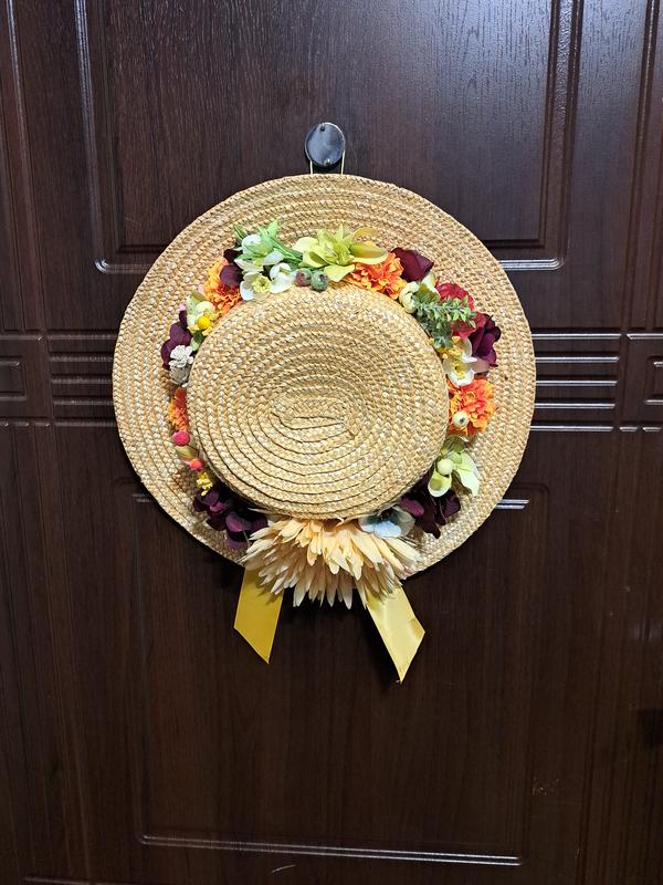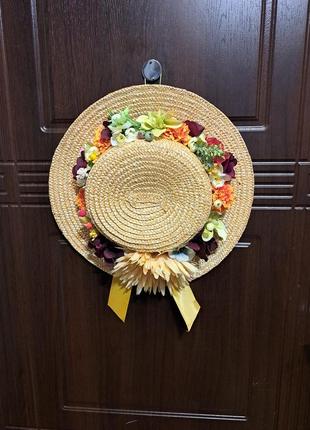 Продаю декор на дверь в виде соломенной шляпки украшенного искусственными цветами. Выглядит очень жизнерадостно.
