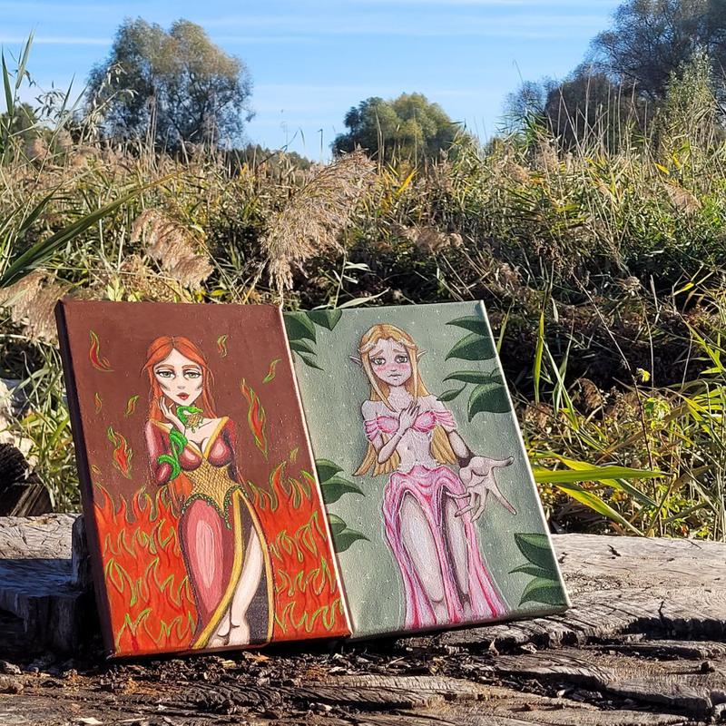 Девушка-осень. Соблазнительная, рыжая огненная девушка со змеем на руке. Темпераментная и любит интересные разговоры. Она всегда знает чего хочет от жизни. 500 грн Девушка-весна. Хрупкая и милая эльфийка, которая нашла Вас в лесу и предлагает Вам приобщиться к прогулке с ней. Она застенчивая и эмоциональная. Любит играть на арфе и делать украшения из жемчужин. 500 грн Две девушки в стиле "аниме". Выполнены акриловыми красками. Размер 20×30