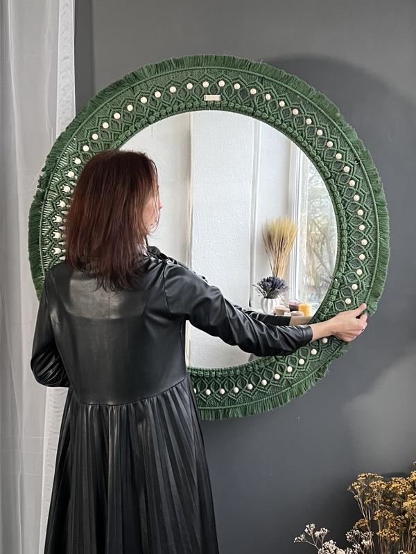 зеркало в оправе с макраме это вау эффект и оно для: изысканности, стиля, эстетики, позитивных эмоций, чтобы сказать самой себе, когда будете в них смотреть "я важна, я люблю себя, я могу и хочу себя радовать и не важно, что думает другие" . зеркало может быть любимого диаметра, цвет макраме также на выбор. эти зеркала сделаны по заказу. их диаметр 80 см, диаметр с рисом 106 см вес 6 кг крепление на зеркале, крючки для стены в комплекте нитки -шнур 4 мм бавовна