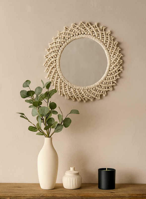 ✨ Декор, который создает атмосферу ✨ Зеркало из макраме — это не просто элемент интерьера, а настоящий акцент, что добавляет тепла и уюта вашему дому. Ручная работа, натуральные материалы и уникальный дизайн делают его идеальным для: 🌿 гостиной 🌿 спальни 🌿 прихожей 🌿 уютных кофеен или студий Можно использовать как рамку для макраме, или же самостоятельный настенный декор. Внутренний диаметр 26 см, внешний 45 см. могу создать рамку в любимом диаметре. Создайте интерьер, в который захочется возвращаться каждый день 🌸