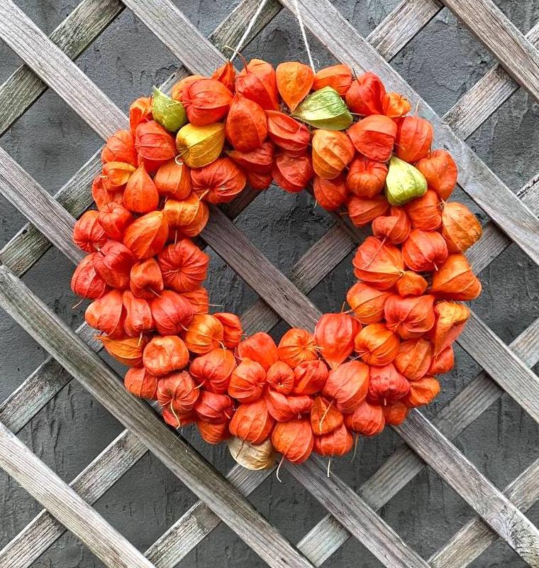 Красивий яскравий віночок для дому з сухих ліхтариків фізалісу, Виконано на основі з сухої трави. Є петля для підвішування. Діаметр вінка близько 30 см