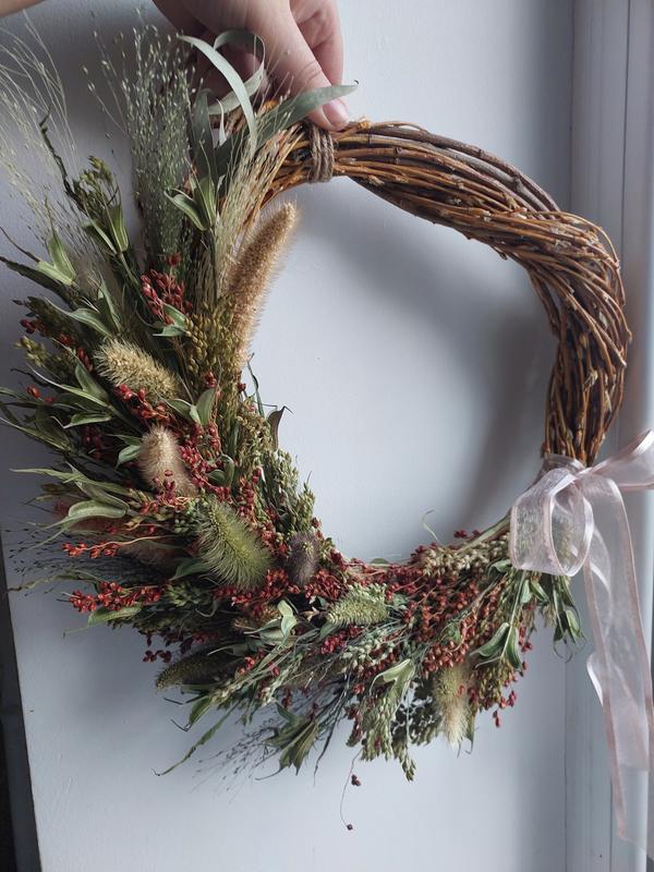 Венок изготовлен на основе из лозы. состав сорго Сетария просо Нигелла