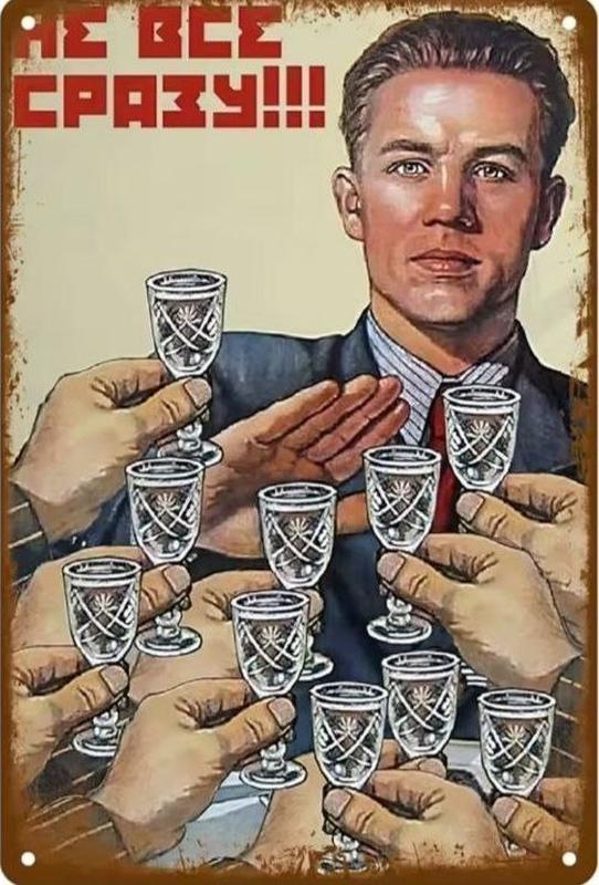 Ироничный постер, основанный на классическом советском агитационном сюжете. Мужчина в костюме, окруженный множеством рук с рюмками, и надпись-мем «НЕ ВСЕ СРАЗУ!!!». Стиль: Ностальгия, Советский юмор, Барный декор. Отлично подойдет для создания веселой и непринужденной атмосферы. Материал: Прочная металлическая пластина с яркой, полноцветной печатью. Имитация состаренных (ржавых) краев. Размер: Увеличенный формат 20×30 см. Использование: Идеальный подарок с юмором для друзей, любителей застолий, а также для декора домашнего бара, кухни, дачи или комнаты отдыха. Особенности: Культовый сюжет в новой, остроумной интерпретации. Качественный принт, легкость крепления. Рассмешите гостей и создайте праздничное настроение с этим ироничным постером!