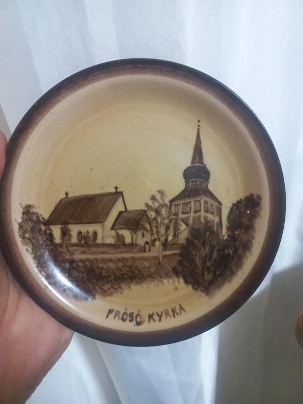 На картинке – декоративная тарелка с изображением церкви Фрессе (Frösö kyrka), находящаяся на острове Фресен, что в Швеции. Церковь Фрессе — это паломническая Церковь с богатой историей, строительство которой, вероятно, началось в конце 19301 века. Она расположена на крупнейшем острове озера Стуршен. Современный вид интерьера церкви был восстановлен в 1930 году после пожара. Звонница была построена в 1754 году и имеет большой звон Биргитты, датируемый XIV веком.