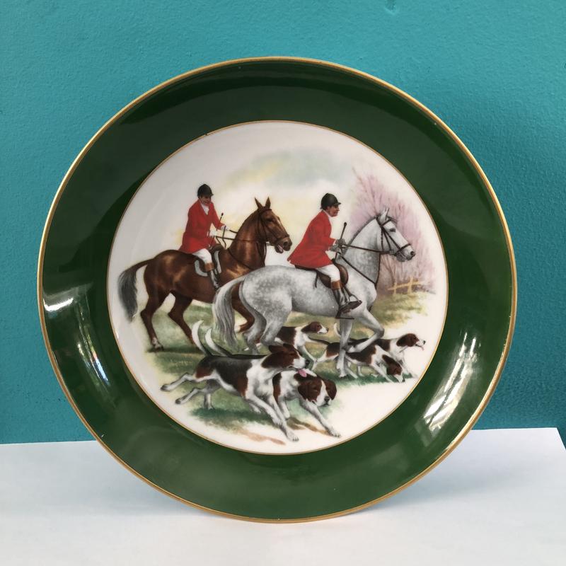 Тарілка фарфорова фірми Кайзер Німеччина. Виготовлена в минулому сторіччі. Гарна в зеленому кольорі. Діаметр 19 см. Глибока. Печатка та підвіс присутня . Малюнок- мисливська тематика . Без сколів та тріщін.