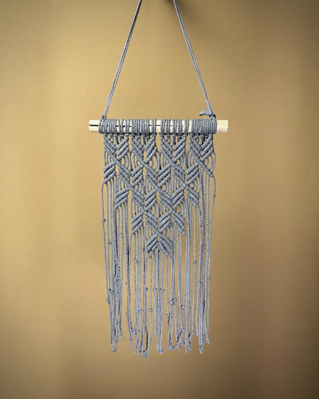Настінне міні макраме панно в стильному мінімалістичному сучасному сірому кольорі ручної роботи. Виготовлено з натурального бавовняного шнура та соснової деревини обробленої і заготовленої власноруч Розміри: 25 см × 46 см
