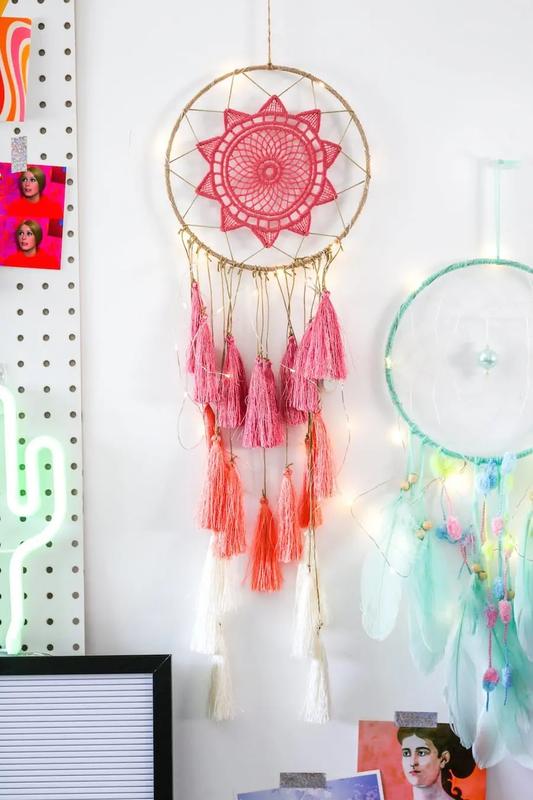 Ловець снів рожевого кольору з гірляндою. Стильний та атмосферний декор для спальні, дитячої кімнати або фотозони. М’яке підсвічування гірлянди створює затишок і теплу атмосферу. Чудово підійде як оригінальний елемент інтер’єру або подарунок.
