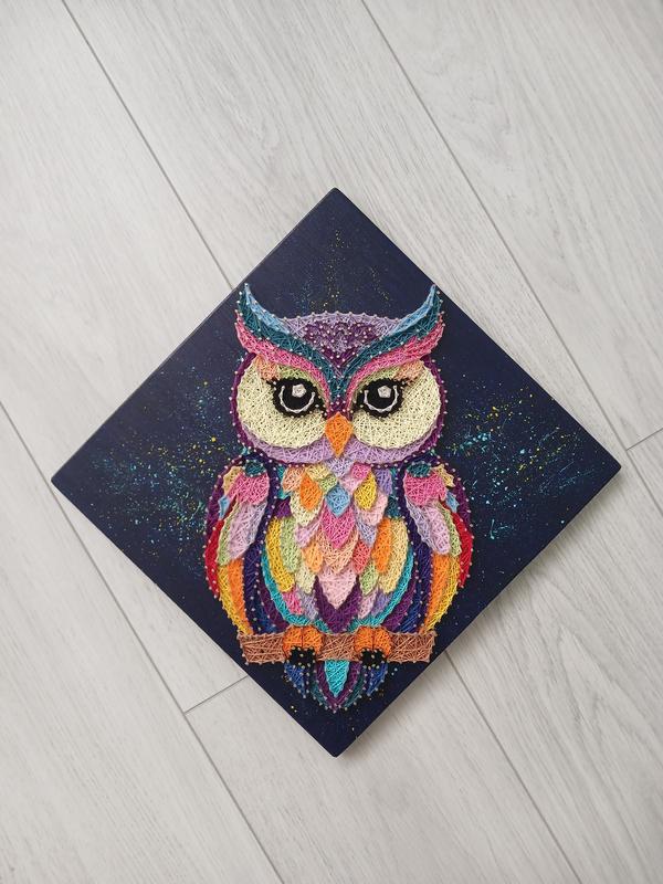 Картина выполнена в технике стринг арт. На деревянной основе набивается гвоздями рисунок и "раскрашивается" нитями. Размер: 30×30 см Материал: сосновый щит обработан, окрашен и покрыт прозрачным лаком; нитки, гвозди. С другой стороны есть крепление (чтобы вешать на стену). В наличии есть также другие работы, смотрите все объявления.