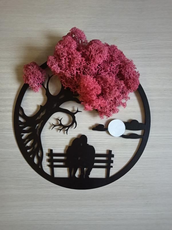 Основа панно виготовлена з металу, пофарбована порошковою фарбою (не має запаху, стійка до вологи, надійна). Мох стабілізований, м'який на дотик, має приємний аромат лісу. Панно слід розміщувати в приміщенні з підвищеною вологістю, подалі від приладів опалення та прямого світла. Діаметр панно - 20см.