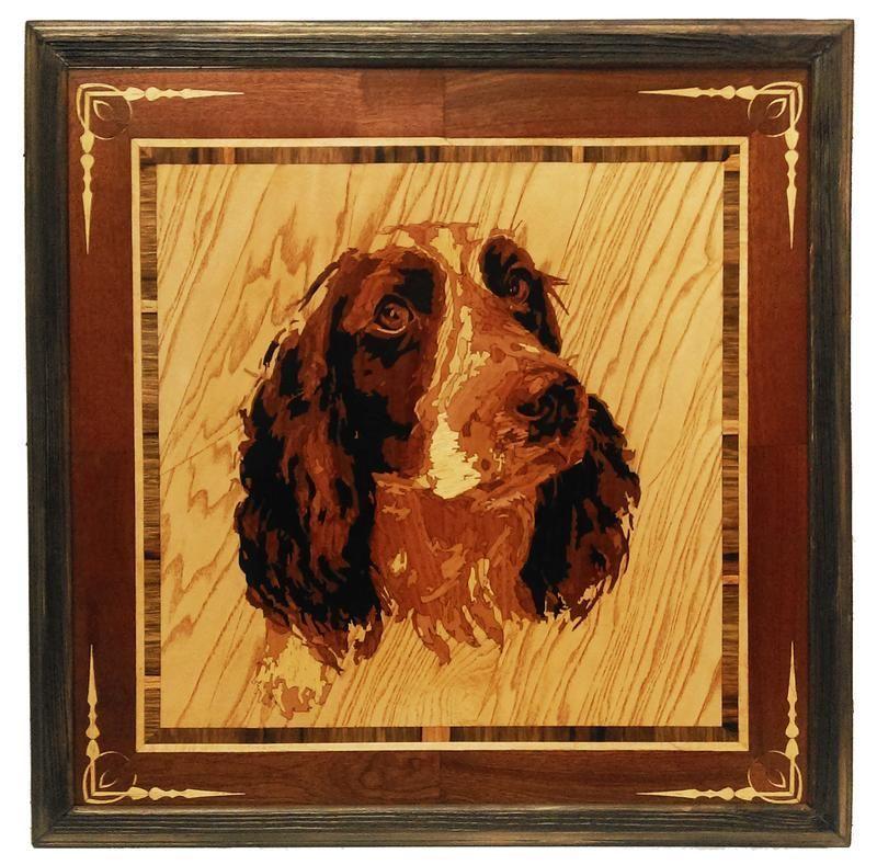 Робота в техніці маркетрі, розмір з рамкою - 55х55 см. При виготовленні роботи використовувався шпон венге, американський горіх, клен сікамора,габон, білий ясень, черешня. Рамка – тонована сосна, брашування, патинація. Робота покрита лляною олією і шелаком. Рамка оснащена підвісами. Приймаємо замовлення на виготовлення портретів вихованців з вашим фото. Можливо виготовлення на замовлення в бажаних розмірах. Робота на замовлення може бути без рамки.