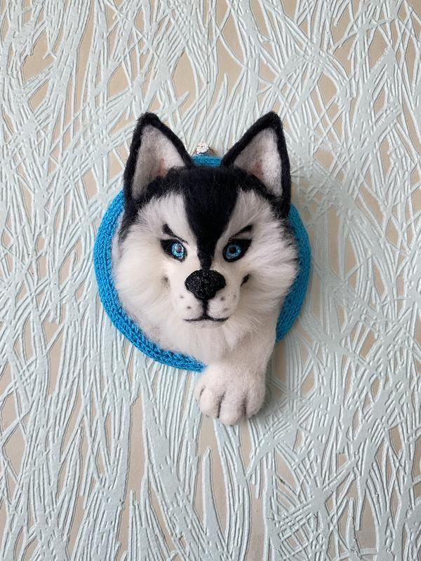 Хаски - 3Д портрет будет прекрасным подаркам всем, кто любит этих больших и выносливых собачек. Хаски - 3Д портрет сделан из новозеландского кардочёса, австралийского мериноса. Тонирован Хаски - 3Д портрет текстильным маркером и акриловыми карандашами. Хаски - 3Д портрет встроен в вязаной рамке и держится на джутовой бечёвке. Размер: длина – 15 см., ширина 15 см. Глазки стеклянные ручной работы, носик валяный и покрыт специальным составом. Ручная работа. В единственном экземпляре.