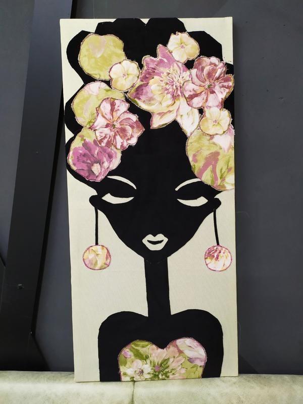 Картина Девушка выполнена из ткани.Прекрасно добавит изюминку Вашему интерьеру.Подойдет как для подарка кому-то или для себя ЛЮБИМОЙ. Размер В 97см х Ш 45см.