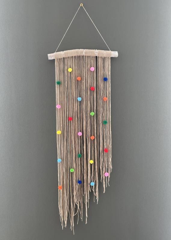 Макраме панно с декоративными помпонами. Размер: ширина 35 см, высота 90 см. Подойдет в детскую комнату или ярким элементом в спокойном интерьере.