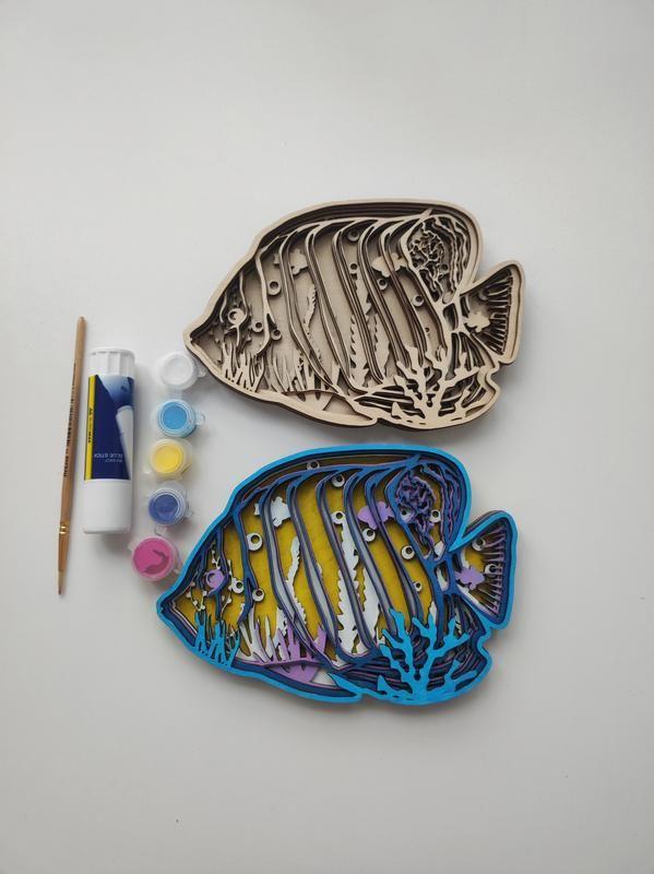 Дев'яна розмальовка У творчий набір входять: дерев'яні деталі (5 шарів); кісточка і акрилові фарби; клей ПВА; кріплення; інструкція. Додатково ви можете придбати круглий панно 30 см. Кольори панно: чорний / білий, сірий /та не фарбоване.