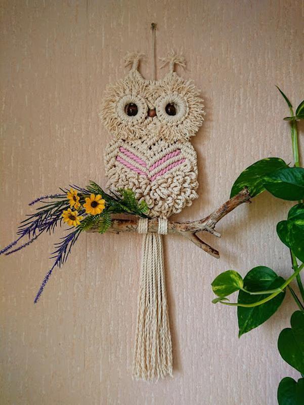 Панно макраме "Сова "Филин" для украшения интерьера, такое панно может украсить детскую комнату, спальню, кухню или прихожую. Панно состоит из 100% хлопкового шнура, бусины натуральные деревянные, веточка деревянная из леса. Размеры панно ширина по глазам 25 см, длинна 55-60 см. Сова продается без искусственных полевых цветов, на фото они присутствуют для декора. Дорогие посетители смотрите ниже и другие мои работы, в ассортименте много изделий для интерьера и домашних комнатных цветов. Желаю всем приятного и интересного досуга) Товар под заказ
