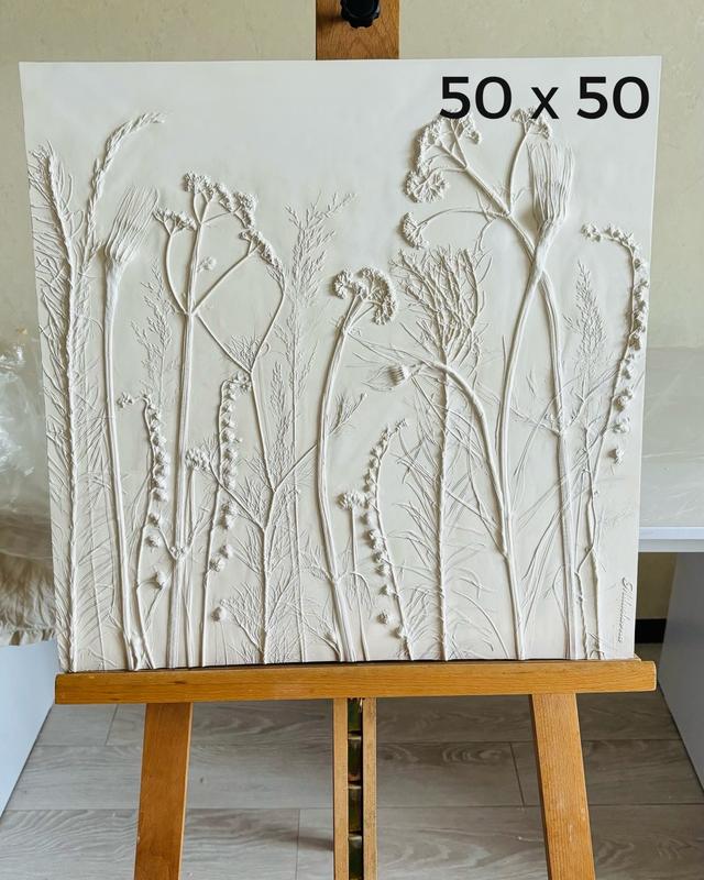 Разнотравье 50 х 50 см Товщина 1,5 см На обороте подвес Барельеф имеет такое тонирование, что в течение дня его оттенок будет меняться от белого до светло кофейного