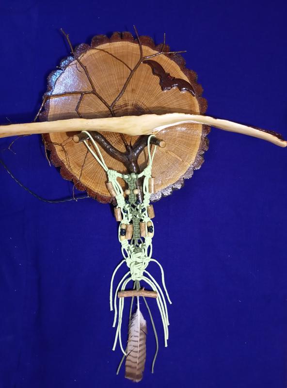 Настенное панно с подсветкой "Тотэм". Дуб (основа и летучая мышь), граб, липа, сирень (двухцветная древесина поясница "Мисяца"), металлический ободе, светодиодная лента, электрофурнитура, лак, хлопковый шнур, деревянные и стеклянные бусины, маховая перьевая дикая птица. Подсветка контурная сзади панно. Для настроения, красоты и медитации! Фото со всех ракурсов) Отличная, аккуратная работа в несколько этапов. Все цвета натуральные, никакого тонирования, лишь лак подчеркивает яркость каждой породы дерева. Диаметр "Мосьца" 38см, общий размер 73*73