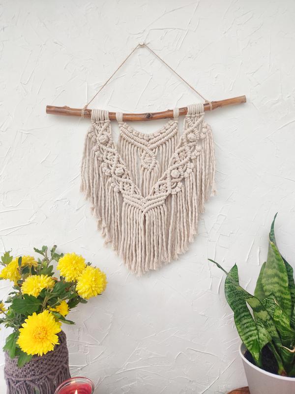 Невелике макрамепанно виконано з бавовни бежевого кольору, палиця оброблена лаком Довжина палиці: 43 см Розмір панно: 36 см* 31 см Можливо виготовлення в іншому кольорі та розмірі під замовлення