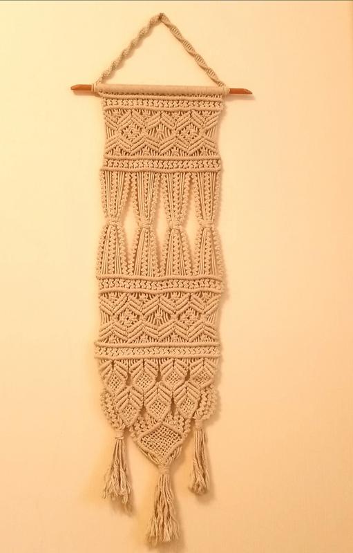 Панно длиной 110 см (+петля 20 см), шириной 31 см, сплетено из хлопкового шпогата