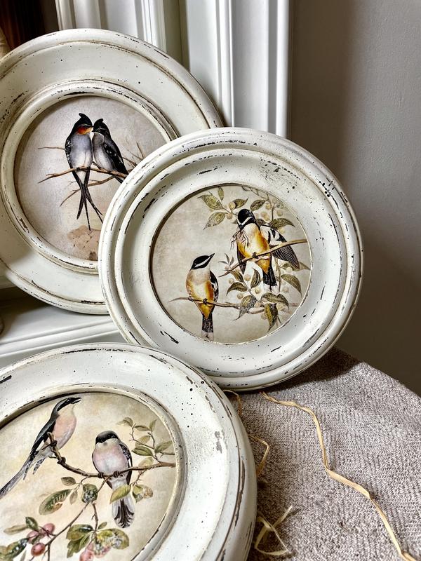 Панно настінне декоративне інтерʼєрне. Робота виконана в техніці декупаж. Рама виконана в дереві,покрита акриловою фарбою і штучно зістарена.Ціна вказана за одне,але максимально декоративно вони дивляться в групі.Розмір 24 см- зовнішній 16см-внутрішнійРобота в наявності.Можливий індивідуальний розмір і колір.