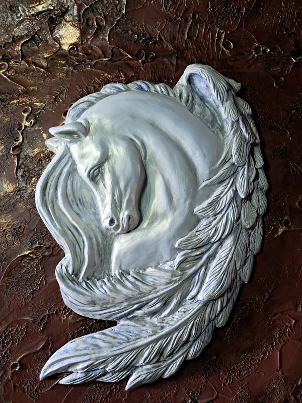 Изысканное настенное панно ручной работы - изящный образ крылатого коня (Пэгас), символизирующий силу, свободу и чистоту. Скульптура выполнена в едином экземпляре, неповторимые плавные линии гривы и нежные перья создают ощущение движения и легкости. Благородный серебристо-перламутровый оттенок гармонично сочетается с любым интерьером – от классики до современного стиля. Идеально подходит в качестве подарка или акцентного элемента декора, привлекающего внимание и придающего пространству магической энергии. Материал: гипсовая шпатлевка Размер: 27× 37 см Крепление: готово к подвешиванию