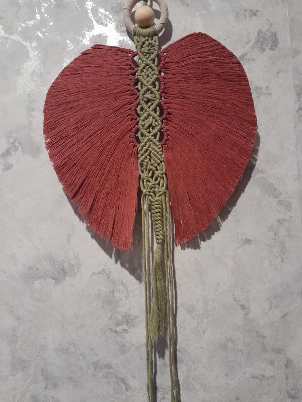 лист макраме с арнаментом на кольце подвесе,цвет терракота и оливковый размер 23 х 47 см с кольцом
