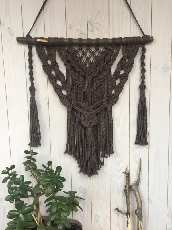 Макраме панно - декор на стену, натуральные материалы: дерево, 100% хлопок, цвет коричневая пастель. Ветка 50см, панно 45*53 см.