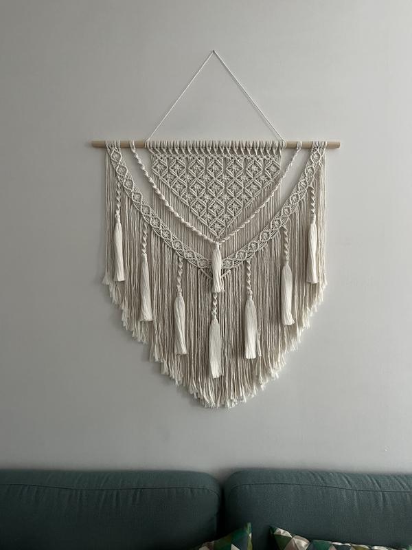 Велике настінне панно макраме - відмінний декор кімнати, натуральне дерево, 100% бавовна. Фото 1-3: довжина основи - 90см, панно 75*100 см, з китицями, колір айворі. Фото 4: довжина основи - 120-125 см, панно 100*120 см, прикрашене китицями з намистинками, колір айворі. Фото 5-7: довжина основи - 78 см, панно 70*90 см, прикрашене китицями з намистинками, колір натуральний. Колір може бути за вашим бажанням.