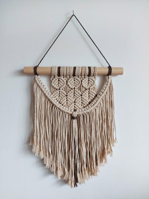 Стильное панно на стену в технике макраме цвета айвори с коричневыми акцентами. Хенд мейд. Хлопковый шнур, дерево. Размер 38*48см