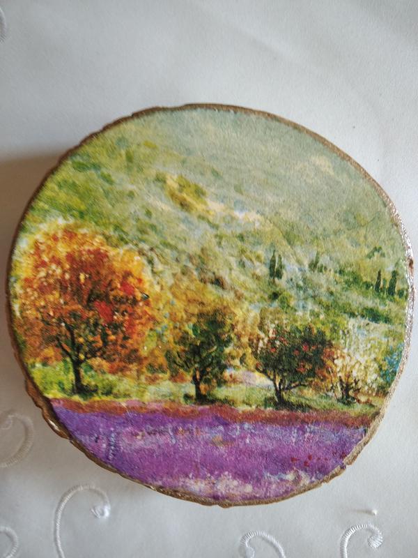 Красивая картина декупаж на срезе дерева. Частичка леса в вашем доме. Прекрасный подарок. Диаметр 14 см.