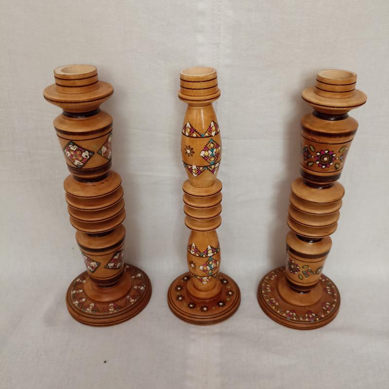 Подсвечники деревянные, расписанные и покрытые лаком Высота: 22 см Диаметр (верх/низ): 5 см/8,3см; 4,4см/8,1см; 3см/6,8см Количество: 3 штуки