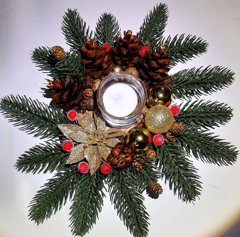 Святковий підсвічник Діаметр дерев'яного кружечка - 11 см. Загальний діаметр ~ 27см. Ціна комплекту ( підсвічник, свічка, скляна підставка для свічки) - 199 грн