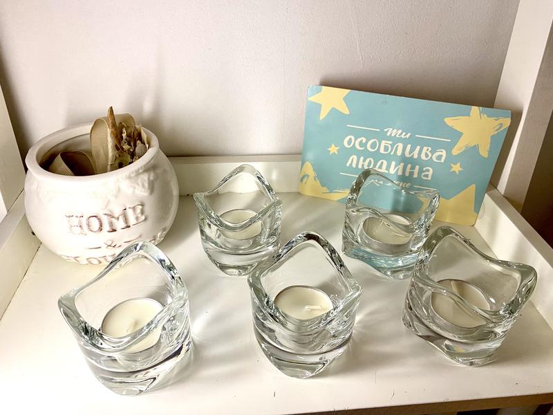 Подсвечник стеклянный с неровными краями. Элемент декора. Для романтических вечеров. К каждому подсвечнику идет свеча-таблетка. Размеры: Наружный диаметр – 5,5 см Внутренний диаметр – 4 см Высота – 6 см Цена набора из 5 шт. – 590 грн.