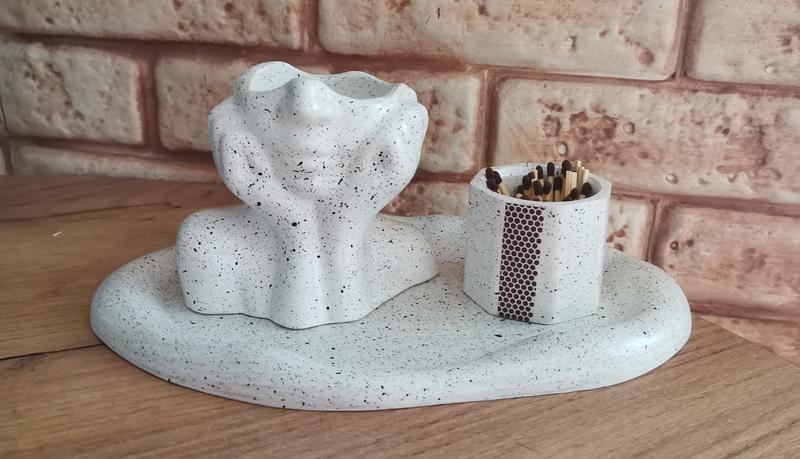 Материал :гипс. Размер : Подставка 24см*17 см. Кашпо 11 см*9 см. Кашпо с лентой для зажигания спичек 5.5 см*4.5 см. Покрытие :лак.