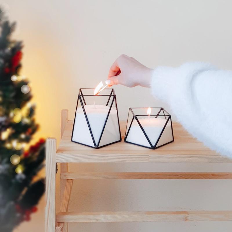 Набор из 2х интерьерных подсвечников с насыпными свечами❤ Подсвечники ручной работы, выполнены из стекла и металла, цвет швов чёрный. Отличное дополнение интерьера или подарок, всё необходимое в комплекте: - 1й подсвечник 11*12 см - 2й подсвечник 7*12 см Гранулированный воск - 300 грамм + 180 грамм для каждого подсвечника Фитиль 12 шт по 5 см -- в комплекте **данного количества воска хватает чтобы засыпать ёмкость 1 раз, как на фото Если Вам необходимо докупить насыпной воск (для последующией засыпки в форму) и фитиль дополнительно напишите об этом в комментарии к заказу👉🏻 в продаже воск от 0.5 кг 0.5 кг насыпного воска - 100 грн фитиль 1м - 15 грн _______________________________________ Насыпной воск очень долго горит, 100 грамм воска = 8 часов горения. То есть сумарно время горения всех свечей около 38 часов 👌🏻 Как сделать насыпную свечу: 1. Насыпать воск из пакета в подсвечник, разровнять. 2. По центру вставить фитиль, оставив 5 мм над поверхностью и зажечь. 3. После использования - потушить свечу, дождаться застывания воска, вытащить окурок с фитилем, обновить свечу п. 1 и 2.